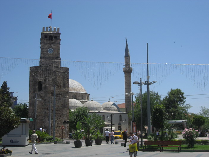 Uma semana tinha se passado e cedo fomos ate Antalya, onde teoricamente faríamos só uma conexão. Ficamos sabendo que todos os ônibus estavam lotados ate a metade da tarde. Deixamos as mochilas no guarda volumes e fomos conhecer a cidade. A parte velha da cidade e totalmente renovada, ficando artificial demais. As ruas estreitas, arquitetura que poderiam ser interessantes parecem de mentira. Dezenas de turistas para cima e para baixo, um sol e calor infernal e pessoas tentando vender passeios de barco, fizeram com que não aproveitássemos tanto o lugar. Optamos por sentar num restaurante, tomar alguma coisa e bater papo. O lugar e bonito, alto com vista para o mar, mesquitas e bastante estiloso, mas na verdade não nos conquistou. Pegamos mais um moderno trem elétrico (o desenvolvimento da Turquia tem nos impressionado!) para voltar para a rodoviária, e seguir viagem.