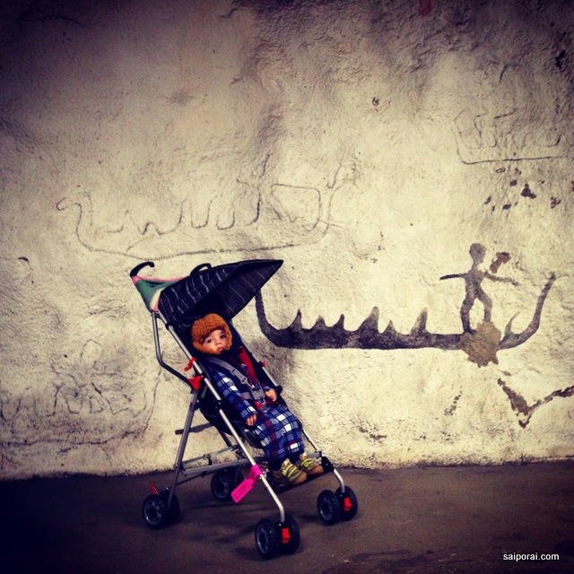 Pinturas imitando pinturas rupestres em uma estação de metrô