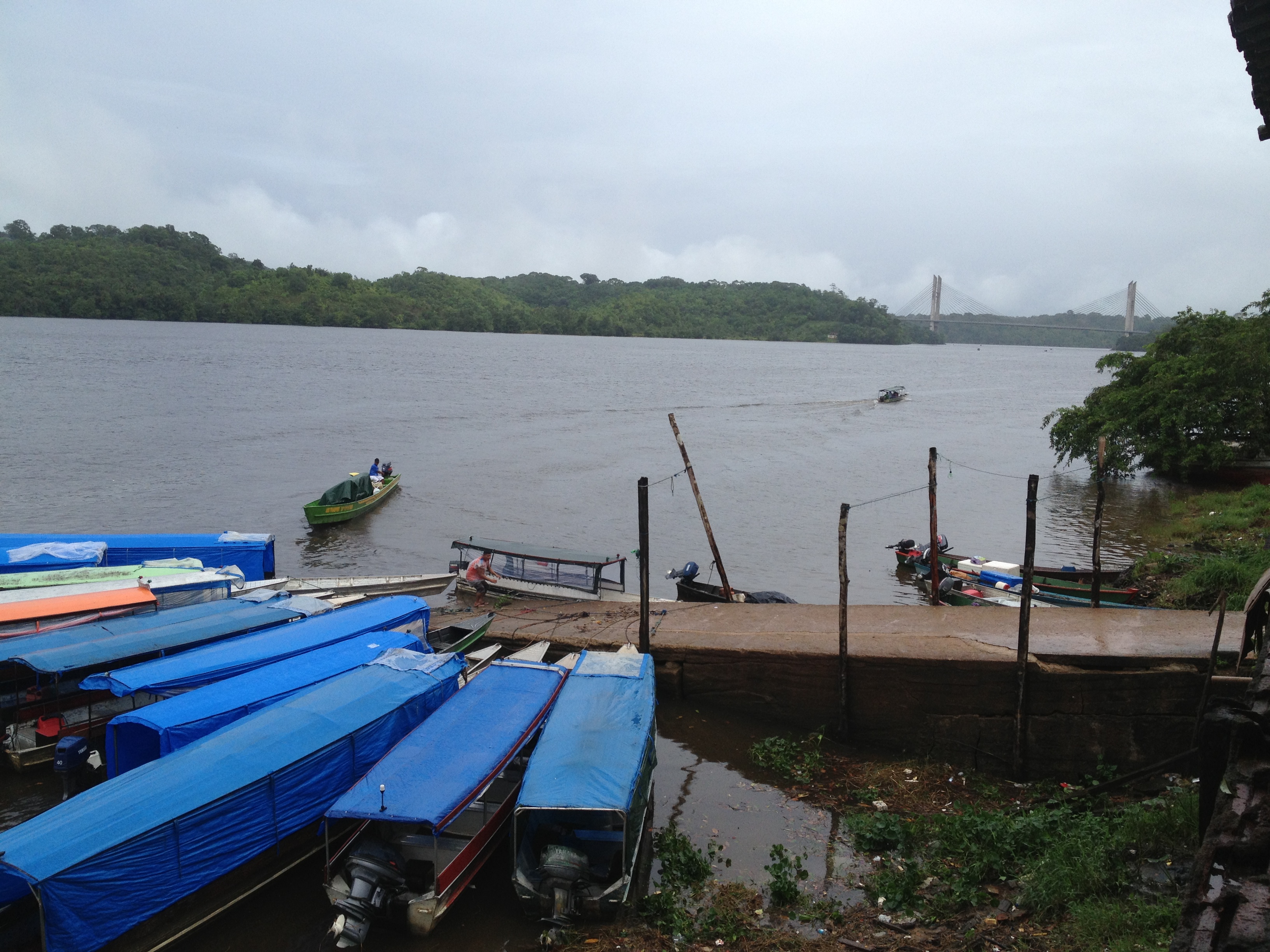 Barcos em Oiapoque, com a nova ponte pronta ao fundo, mas não funcionando.