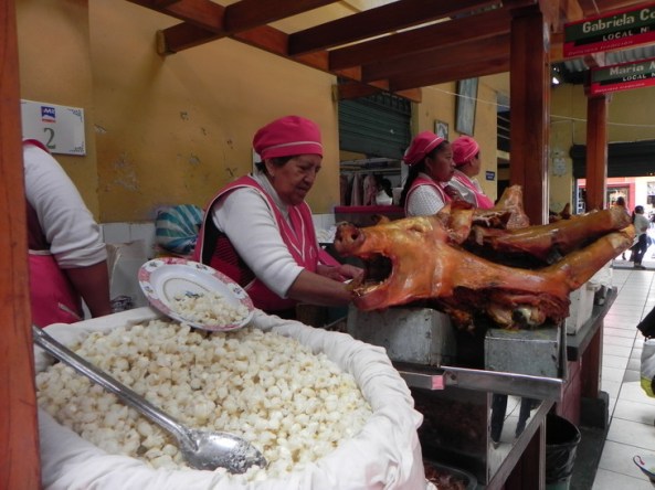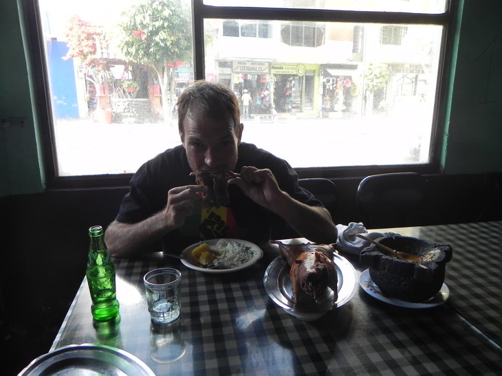 A cidadezinha é bonitinha, com a igreja na praça central, ruas com lojinhas, mas o tipo de lugar que eu aproveitaria melhor se tivesse com a Bibi. Em vez de ir num restaurante descolado fui comer Cui, tipo de porquinho-da-Índia que é muito apreciado por aqui. Sabe que a carne é bem boa? Tipo frango? Não, muito melhor!