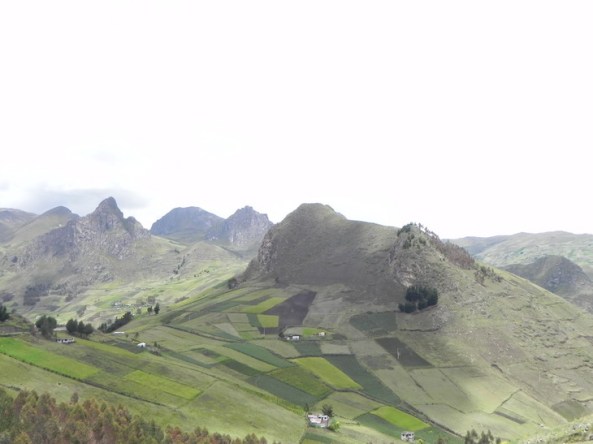 Peguei um ônibus para Latacunga, novamente cheio de vendedores e com bonitas paisagens. Ah, as passagens custam menos de 1 usd por hora de viagem e muitas vezes tem filme passando. Assim que cheguei um vento gelado e forte soprava, e no fundo da cidade dava para ver parcialmente o vulcão Cotopaxi. Esta não é a melhor época para se viajar pela região, pois chove e as montanhas muitas vezes ficam encobertas. Assim que cheguei no hotel iniciou uma fortíssima chuva de granizo, que escapei por pouco.