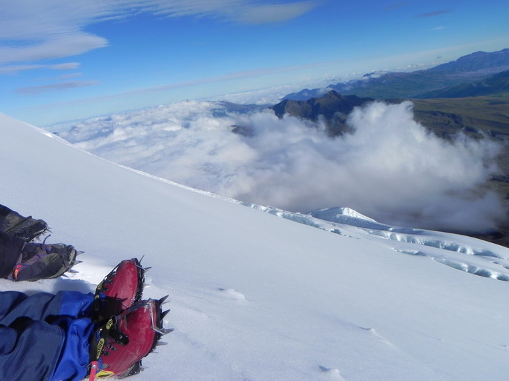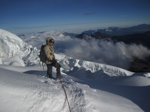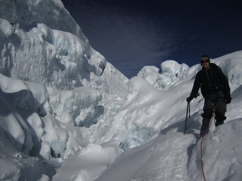 Chegamos na tal rocha antes das 5, então tínhamos 3 horas para fazer o que normalmente se faz em uma. Acontece que a Nayra começou a passar muito mal, e quando faltavam menos de 200 metros ela não conseguia mais seguir em frente. Eu queria ir sozinho, mas o guia disse que não seria possível. Disse também que se deixássemos ela lá para buscar na volta poderia ser perigoso, já que ela estava bem mal, e inclusive com diarréia. Já que tínhamos passado dos 5700 metros, pelo menos esperamos mais algum tempo até o sol nascer para curtir o visual. Na volta pudemos observar as geleiras, os precipícios e paredões que escalamos. Como o fato de não ver as vezes torna as coisas mais fáceis! Na volta eu ia na frente, e os dois atrás. Estava caminhando e escutei um ruído, derrepende o gelo embaixo do meu pé rachou, e minha perna inteira caiu num buraco, aquelas galerias, grotas de gelo. Uma verdadeira caverna. Levei um baita susto, mas por sorte estava com meu machado de gelo bem preso, e nem foi preciso usar a corda.