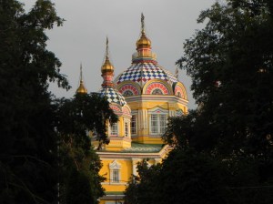 Almaty e uma cidade bem moderna para os padrões da Asia Central. Chegam a dizer que parece europeia, mas so se for do leste europeu. E uma cidade bem soviética toda arborizada, com aqueles prédios em forma de bloco, tudo com as montanhas nevadas ao fundo. Por outro lado, tem bares, cafés descolados, e bastante balada. Carros modernos e caros contrastam com os onibus caindo aos pedaços, e os trens urbanos também. Caminhamos pela parte moderna, pela Igreja Ortodoxa, prédios do governo, teatros, parques e também comemos muito bem.