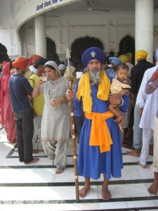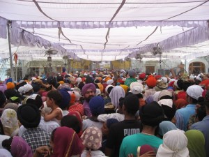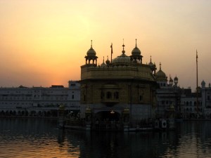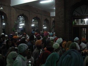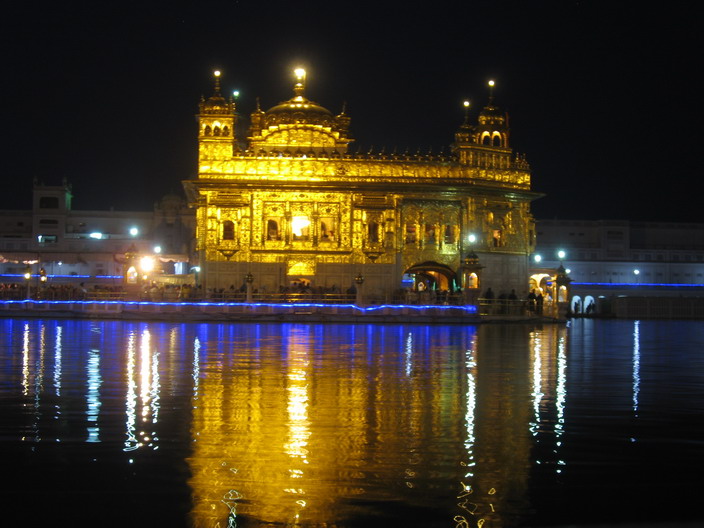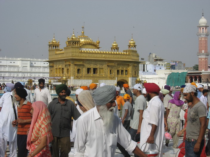 O Sikhismo e uma religião derivada do Hinduismo, mas com diferenças bem marcantes, como o culto a somente um Deus e ser totalmente contra o sistema de castas. Na verdade o Guru Nanak, fundador da religião era um grande pensador, viajou por toda a India, Tibet, Ceilao (atual Sri Lanka) passando pela Pérsia (Iran) e visitando inclusive Meca, na Arabia. Depois de mais de 40 anos ele retornou e fundou a religião, que contem vários aspectos e influencias do Islamismo também. Há quem considere a religião uma especie de filosofia, já que qualquer Deus pode ser louvado em um templo Shikh. Inclusive grandes lideres Sikhs no passado construíram mesquitas, para que a população islâmica da região pudesse seguir sua devoção. Religião bem tolerante e com um aspecto interessantíssimo. Segundo ele, uma pessoa não consegue pensar em Deus se tiver com a barriga vazia, com isto criou as Langars, cozinhas comunitárias, que fornecem alimento gratuito nos templos. O prédio onde ficava meu dormitório era bem perto da gigantesca cozinha/refeitório, e de uma das entradas. Caminhei pelo templo mais de uma duzia de vezes. Bati papo com o pessoal, tomei banho no lago de noite, quando tudo estava mais calmo. Sim de noite, pois fica aberto 24 hs. O bom da proximidade e que já sai descalço, sem ter que se preocupar em deixar o chinelo nos guarda sapatos, ou enfrentar fila.