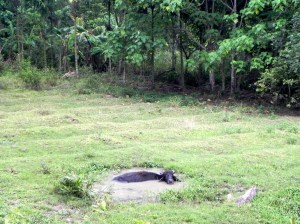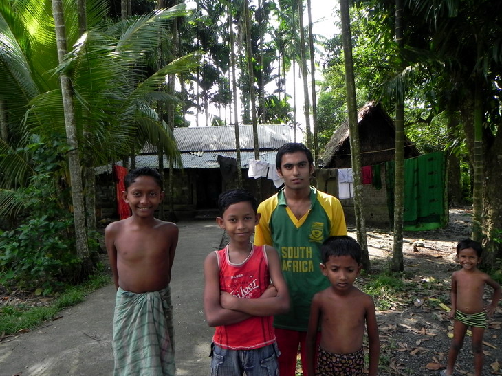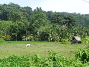 Uma semana ja tinha se passado, e para completar a missão  faltava conhecer as vilas da região  Na verdade não tem uma vila em si, e uma região rural, com as propriedades bem espalhadas. Caminhamos pela “estrada” principal, beirando as plantações de arroz que pareciam fosflorecentes de tao verdes. Búfalos se banhavam em poços de lama, e saris coloridos contrastavam com a mata verde escura. Existem canais laterais que levam ate as outras casas da vila. O caminho ‘e calcado, pois seria impossível transitar por eles depois de tanta chuva. Conversamos com algumas pessoas, observamos a vida passar lentamente na região  o pescador voltar com o jantar, a menina impecavelmente arrumada para a escola tirar os sapatos e meias para caminhar na trilha enlamaçada. A Bibi olhava para tudo aquilo fascinada, e eu pensava comigo com “um pouco de sangue” as vezes vale a pena…