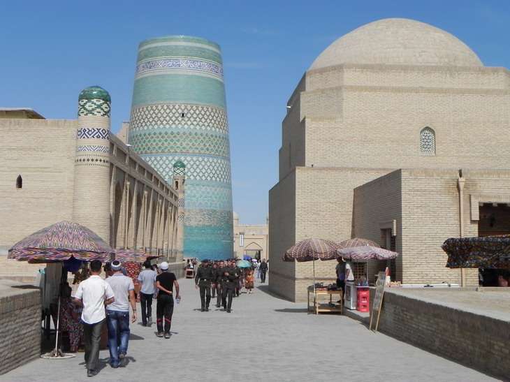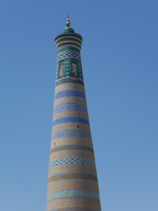 Seguimos pela estrada de péssima qualidade ate Urgench, uns 500 km mais para o norte. Depois de muito deserto, buracos e nenhum estrutura chegamos em Khiva. Ficamos na parte velha da cidade, totalmente murada. Se achamos que Bukara estava perfeitinha demais, ali parecia que tinha sido construído ontem. A cidade ‘e impressionante, tem mesquitas, mausoléus  e mais de 40 madrassas (escolas islâmicas  só dentro da cidade murada. Mas praticamente nada está em atividade, e um grande museu. Muitos dos monumentos tem lojinhas dentro ou viraram pequenos museus. ‘E possível e bem legal, percorrer a pé parte da muralha, e a cidade ‘e mais interessante como um todo do que os monumentos individuais. Subimos por uma escada escura ate o topo de um dos minaretes, de onde tinha uma super vista. A noite caia e tudo ficava desértico  quieto, sem ninguém nas ruas. Tentei comprar uma passagem de trem sem sucesso algum. A comunicação tem sido uma grande barreira, se eu tivesse levado a serio minha ideia de ter estudado um russo básico, as coisas seriam mais fáceis.