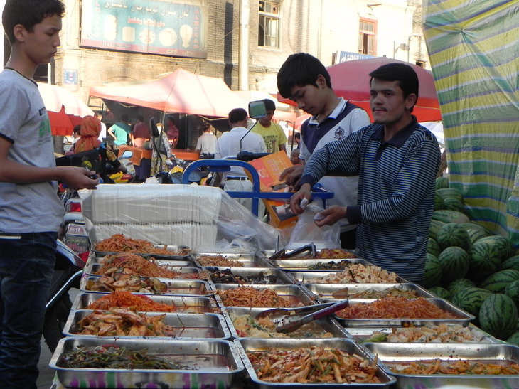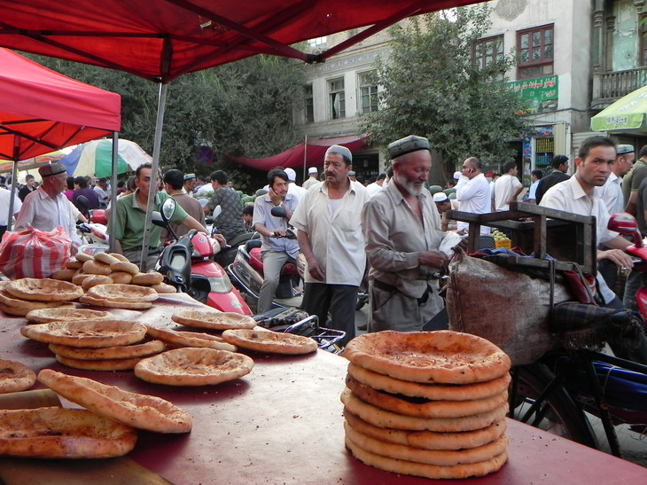 Tínhamos alguns dias ate o final de semana, quando teria o famoso mercado de domingo e o de animais. Kashgar ‘e uma cidade comercial a muuito tempo, uma das principais da rota da seda. Aqui a rota se dividia, e seguia mais a leste para Xiang ou para o sul, sentido India. Rodamos a cidade velha varias vezes. Final de tarde ficava caótica  cheia de barraquinhas de comida. Muitas comidas boas, e outras bem diferentes. Mas tudo por uns poucos trocados. Como ‘e Ramadan, as pessoas estavam loucas para pegar comida e fazer sua refeição assim que o sol se por. Muiitas opções de comida, entre fornos fazendo pão na hora e carnes penduradas sem nenhuma refrigeração. Sweet caos!!