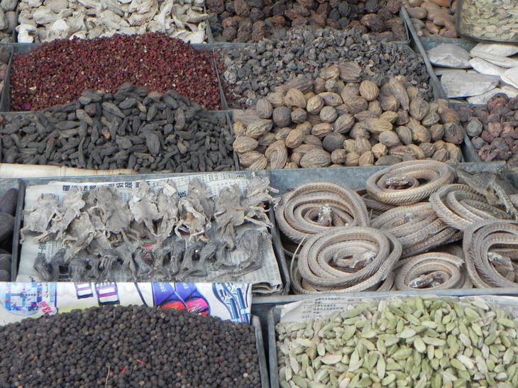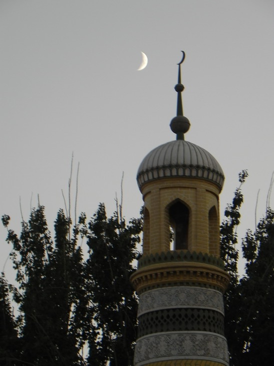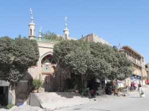 Estávamos a uma quadra da cidade velha e na nossa primeira caminhada, aquela boa surpresa, lojas de antiguidade, temperos, frutas, alem de cobras e lagartos secos para vender dando todo um clima. Os uygurs super simpáticos  puxavam papo e logo chegamos na praça onde tem a antiga mesquita Kha. Logo percebemos uma movimentação de exercito e tropa de choque, que nos assustou um pouco. Depois entendemos a situação, e ate nos acostumamos com as tropas e carros camuflados.