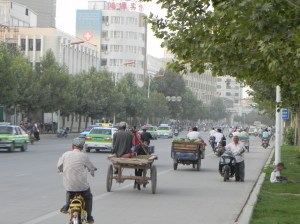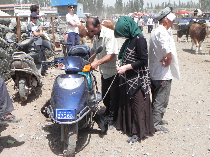 Pegamos um táxi ate o mercado de animais, mas acabaram nos deixando no lugar errado. Pegamos um trator de volta. Isto, um trator. Kashgar pode estar se modernizando, mas ainda e muuito comum ver pessoas andando de trator nas avenidas, de carroça e de burros. Muitas vezes na contramão  sem causar nenhuma estranheza. Chegamos no mercado de animais na metade do dia, e estava quente, muito quente. Já na entrada um caminhão saindo com Yaques (aqueles bois peludos dos Himalaias) se debatendo dentro de caminhões  Pessoas colocando ovelhas no porta malas ou amarrando na sua moto. Uns levavam no colo, outros davam chutes nos bichos. Vacas, cavalos, cabras, ovelhas, camelos, yaques, tudo num patio empoeirado, mas bota empoeirado nisto. O lugar parecia congelado no tempo. As pessoas, deitadas na sombra e sem tomar água por causa do Ramadam eram uma atração a parte. Só não imaginávamos demorar tanto para pegar um transporte dali. Ficamos um tempão buscando carona, táxi  carroça ou ate um trator. Tudo passava lotado, mas depois de muita insistência deu tudo certo.