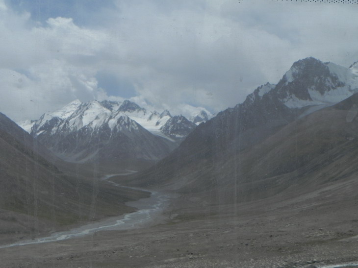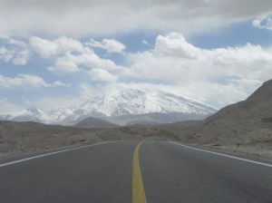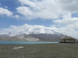 Ao chegarmos no lago Kara Kul, já sabíamos que iriamos passar a noite la, mesmo contra a vontade das autoridades chinesas, que nestas alturas nem tinham mais controle sobre nos. Procuramos yurts ao norte do lago, e achamos uma família muito simpática  Eram Kyrgs, mesmo sua família nunca tendo tido nenhum contato com o Quirguistao. Kyrg ‘e etnia, não nacionalidade! Para nossa surpresa nosso amigo japones Koich, que conhecemos no Quirguistao, tambem estava acampando la. Camelos na beira do lago e montanhas com mais de 7 mil metros davam o clima. Yurt nada turístico  dormimos todos juntos, e acordamos cedo com nosso anfitrião rezando e comendo antes do sol nascer (lembram que e ramadan?). Aproveitamos e saímos cedo, por paisagens tao fantásticas quando no dia anterior. Chegamos em Tashkurgan, terra de Tagics e fomos direto ate a imigração  onde aguardamos o único ônibus diário por um bom tempo. Fizemos todos os procedimentos de saída do pais, embarcamos no ônibus acompanhados por soldados chineses, que viajaram com a gente por mais algumas horas, teoricamente passando por terra de ninguém  mas que esqueceram de avisar os pastores e seus yaques. Os soldados chineses desceram do ônibus e estávamos no Khunjerab pass, a quase 5 mil metros de altitude. Avistamos a primeira bandeira paquistanesa, mas ainda levaria algumas horas (e centenas de curvas) ate chegarmos na imigração do pais.