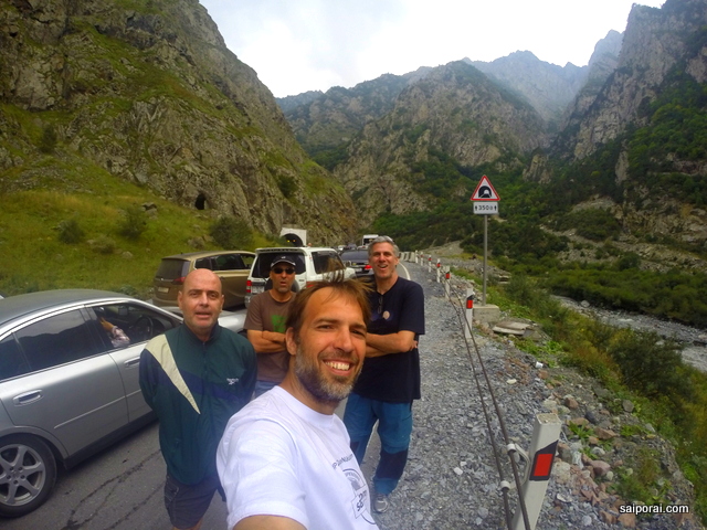 A equipe! Agora parados em um congestionamento na “terra de ninguém”, entre Ossétia (Rússia) e Geórgia