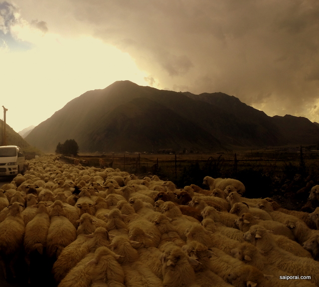 Mas não chegaríamos com tanta facilidade à Geórgia. ainda tinha toda a “Terra de ninguém”entre as duas fronteiras. Nosso motorista fez o possível e impossível, ultrapassou filas dentro de tuneis e tudo, mas uma hora tudo parou. Ficamos um bom tempo parados em congestionamentos, só observando a “mafia dos fura fila”. Nos aproximando da República da Geórgia a situação foi se normalizando. Na imigração nos olharam com certa suspeita, fizeram meia duzia de perguntas e nos liberaram. O transito fluiu e não demorou muito para chegarmos próximo de Kazbegi. A noite se aproximava e não imaginávamos ter que enfrentar um novo congestionamento, quando de repente cruzamos com milhares de ovelhas!! Uma situação no minimo inesperada, mas para falar a verdade nada mais nos surpreendia…