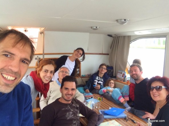 Eles já estavam viajando há uns dois dias, já entendendo bem sobre o funcionamento do barco. Um barco grande, com 4 suítes, para três pessoas cada. Tinha que ser assim, estávamos em oito adultos, um adolescente, uma criança e dois bebes.