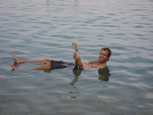 De Masada ate uma praia no Mar Morto foi rapidinho. Tentamos um resort particular mas achamos que não valia a pena. Achamos uma publica que tinha toda a estrutura de chuveiros e ate vestiários, que cumpriu super bem o papel. Enquanto o pessoal foi se trocar eu já fui nadar, ops, boiar. O Mar Morto e o local mais baixo da terra, a 416 metros abaixo do nível do mar. Ele e tao salgado que o empuxo faz você boiar. Muito divertido!! Da para ver pedaços de pedras de sal. O gosto da água e horrível, e se for nos olhos você terá problemas.