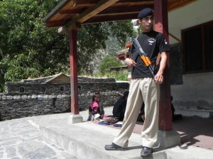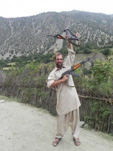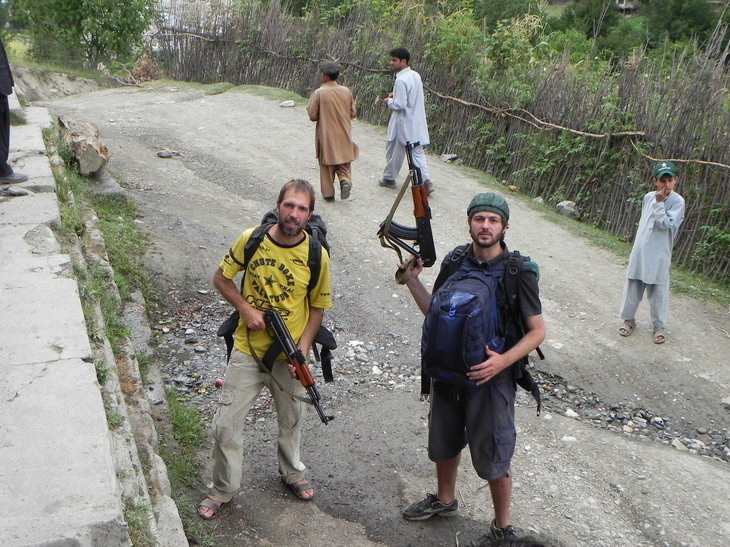 Na manha seguinte eu e o Jonny queríamos ir para Bumburet, a principal vila. O Jonny queria mandar noticias e eu visitar o pequeno museu que conta das tradições locais. Foi aquela dificuldade para arranjar transporte, já que nenhum carro passava. Já pensava em ir a pé, ou substituir o programa por alguma parte da vila nas montanhas aos arredores, quando vi um clima de tensão entre os soldados da nossa escolta. Eles conversavam entre si e pareciam não saber muito bem o que fazer. Vieram me explicar que Talibans atacaram um posto de fronteira do Paquistão matando dezenas de soldados. Outras dezenas de Talibans também foram mortos. Tudo isto a 60 km de onde estávamos Tínhamos que evacuar a área o mais rápido possível, pois ali não teríamos proteção se comparado com Chitral, a cidade ao lado que chegamos, que contava com uma forca militar que esmagaria os talibans em um minuto. Mas já tínhamos perdido um bom tempo buscando transporte sem sucesso, e agora não seria diferente. Tentamos mais um pouco e seguimos a pé mesmo, com os soldados nos escoltando. Depois de um tempo apareceu uma caminhonete, e pegamos carona. Estávamos nas intermináveis curvas com precipício quando de trás de uma curva cega, vem um senhor correndo e gritando. O pessoal da caçamba traduziu para nos, mas a Bibi e Jonny estavam na boleia, e não sabiam o que estava acontecendo. Logo depois seguiram três explosões. Os dois quase morreram de medo, achando que os talibans estavam ali na frente!!! Na verdade estavam só dinamitando umas pedras para aumentar a pista. Cômico, mas acho que eles se borraram…
