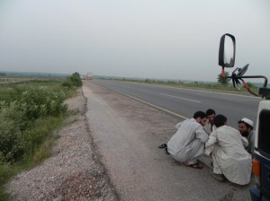 Chegamos perto da moderna auto estrada e nossa escolta parou. Só abanamos e seguimos pela estrada de três pistas cada lado, de dar inveja as estradas brasileiras. Com o por do sol paramos para a oração e desjejum. O motorista e os passageiros estenderam um tapete em frente ao ônibus comeram frutas e sucos e rezaram. Algumas filas de carro pararam atras fazendo o mesmo. Todos riam do dia que passou e nos ofereciam insistentemente comida. Chegamos tarde em Rawalpindi, pagamos um pouco mais para diminuir o prejuízo do motorista e fomos buscar um lugar para descansar!