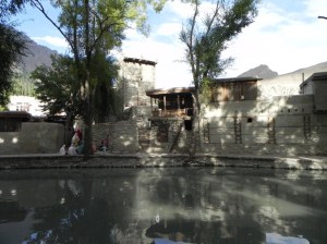 Um dia decidimos descer montanha ate a vila de Ganish, na beira da KKH. E uma cidadezinha mega antiga, com casas tradicionais, mesquitas todas trabalhadas em madeira e um lago como “praça” principal. Alguns antigos caravansarais ainda estão la, e a madeira onde os cavalos (ou camelos) eram amarrados continua ali, gasta de tanto ser usada. Fiquei pensando se o Ibn Batuta ou o Marco Polo amarraram seus cavalos ali. Existe um interessante sistema de refrigeração para alimentos, utilizando água gelada da montanha canalizada. Foi o primeiro lugar onde mulheres chamaram a atencao da Bibi por causa da roupa. Ali eles eram sunitas, e o mês sagrado do Ramadan deveria ser respeitado.